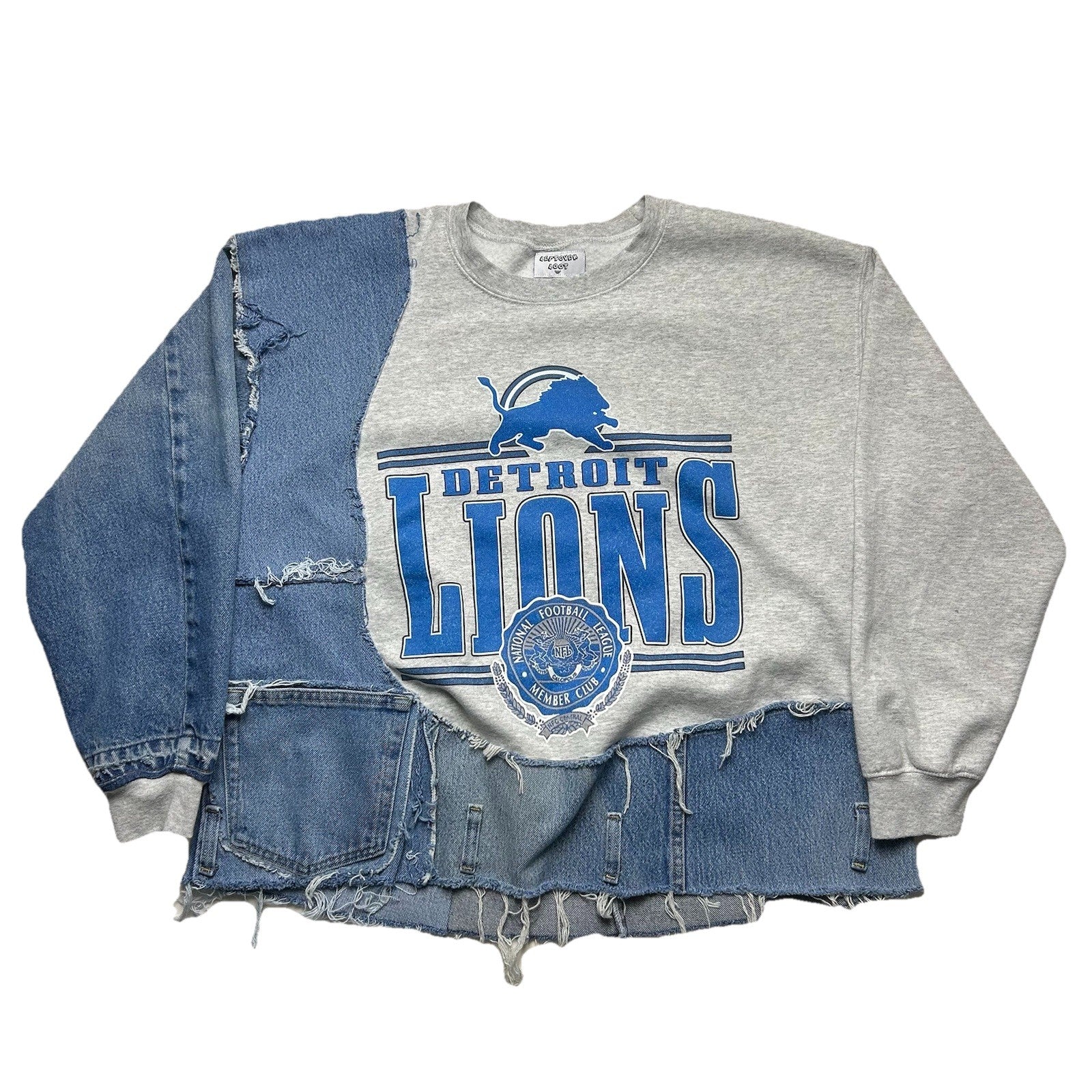- Custom sewn using a vintage Detroit Lions crewneck and denim scraps